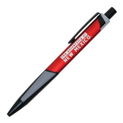 Retractable ballpoint pen with black soft rubber grip. Black trim. Packaged in peggable gift box.